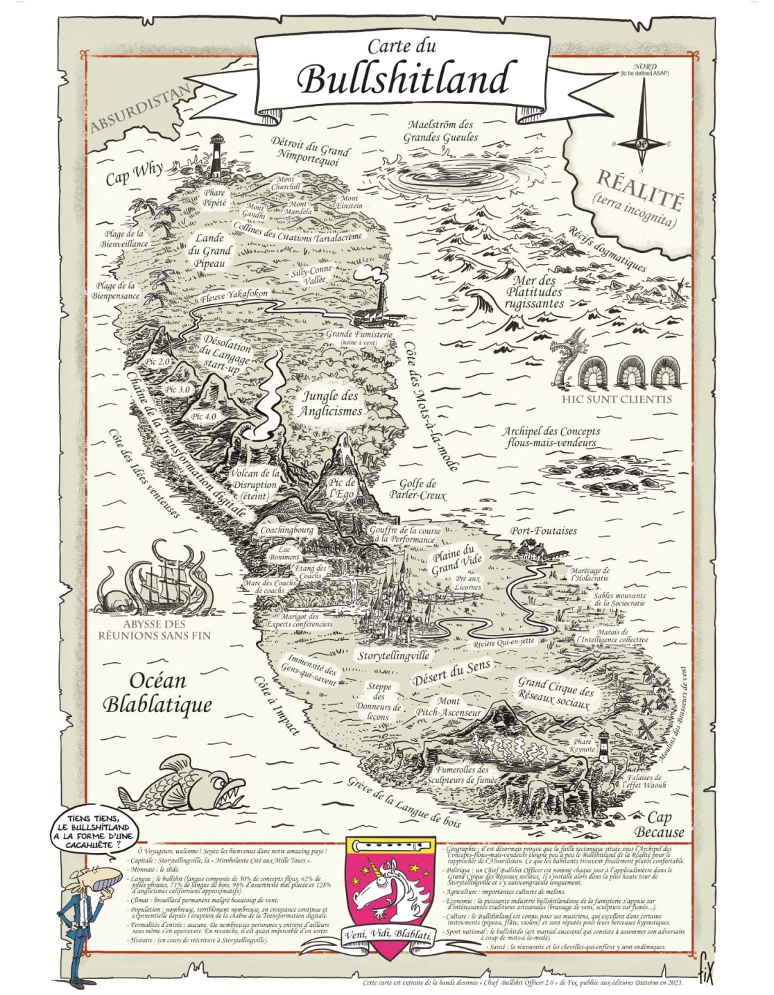 Extraite au départ de Chief Bullshit Officer 2.0, cette carte du Bullshitland a été depuis considérablement enrichie. Format poster (50×70), elle embellira les murs de votre open space ou home office, pour un environnement parfaitement agile, disruptif et self-on-boarding.